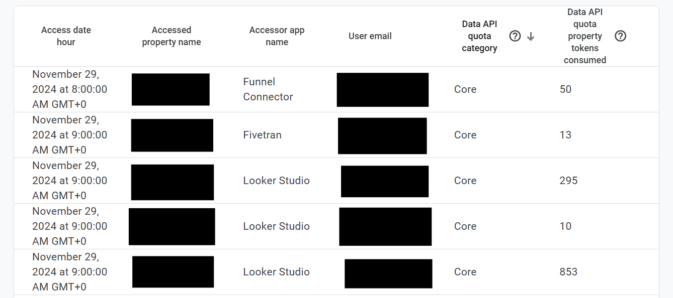 And you will see things in your “Accessor app name” column like: third party connections like Fivetran, Funnel and of course Looker Studio.