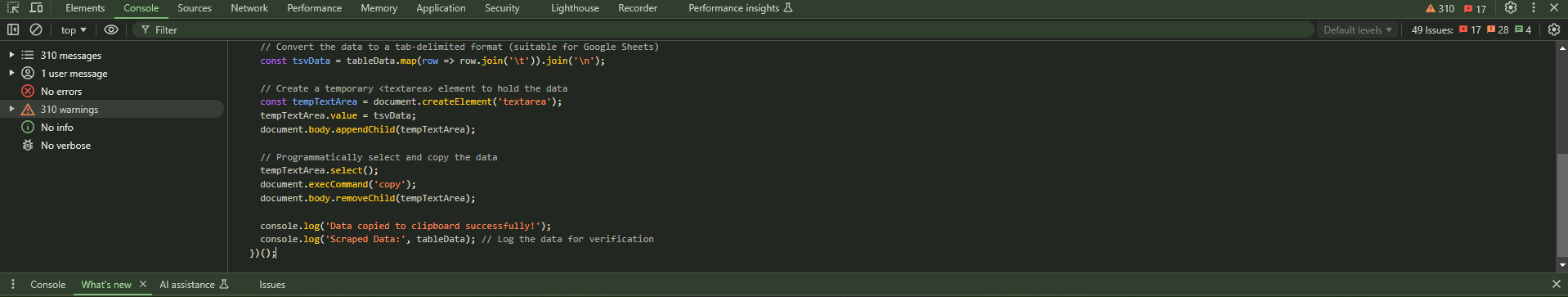 console.log('Data copied to clipboard successfully!');