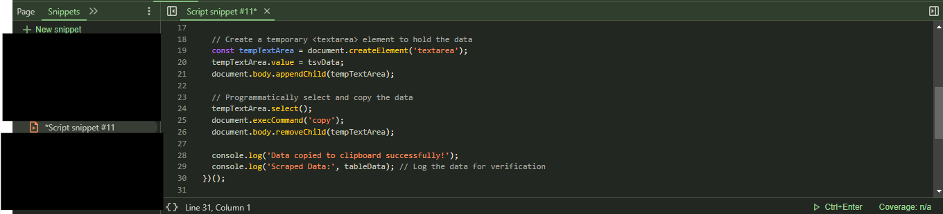 Now this will run the script at a few clicks (as opposed having to paste the code in every time or pressing up on the the console and executing the script every time). Personal preference though. But it also means it will save it here for as long as you want to run it. Which makes the heavy lifting a bit easier for scraping the page.