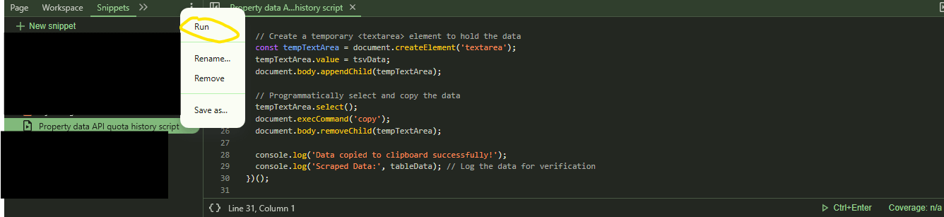 Now every time you want run the script, all you need to do is to navigate to the same section in the console, Sources > Snippets and right click on the script and select Run: